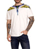 La t-shirt County of Milan F5camath029 in color panna è un capo essenziale per l'uomo contemporaneo. Realizzata in morbido jersey di cotone al 100%, questa maglietta si distingue per l'iconica stampa "ali County of Milan" multicolore sia sul fronte che sul retro. Un perfetto equilibrio tra comfort e stile.
