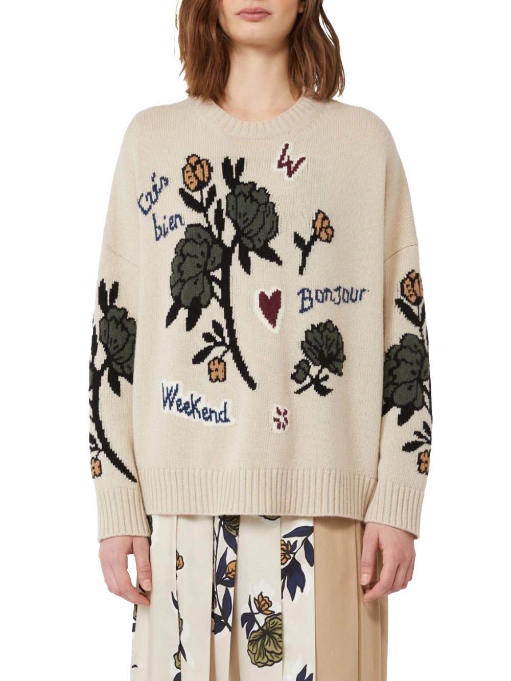 Scopri la maglia oversize 2525366262 nel colore beige, un capo intramontabile perfetto per le amanti dello stile casual-chic. Questa maglia è realizzata in filato di pura lana, e presenta una lavorazione intarsio con disegni di collezione ben distinti sul davanti e sulle maniche, per un look unico e alla moda.